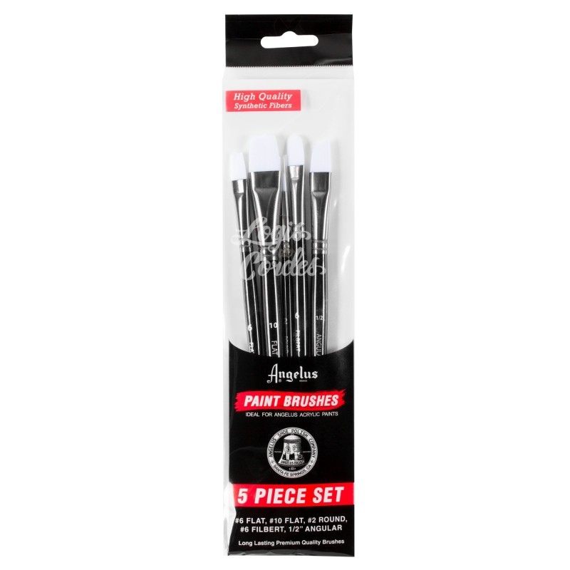 The Angelus brush set with synthetic bristles is perfectly suited for the Angelus colours. This set contains : 1x Angelus Paint Brush- 2 Round 1x Angelus Paint Brush- 6 Flat 1x Angelus Paint Brush- 10 Flat 1x Angelus Paint Brush- 6 Flat 1x Angelus Paint Brush- 1/2" Beveled