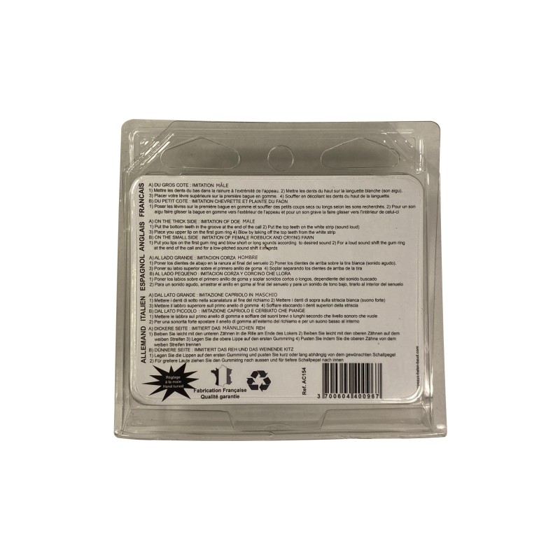 Helen Baud's deer calls reproduce the male on the large side and the fawn's whine on the small side.