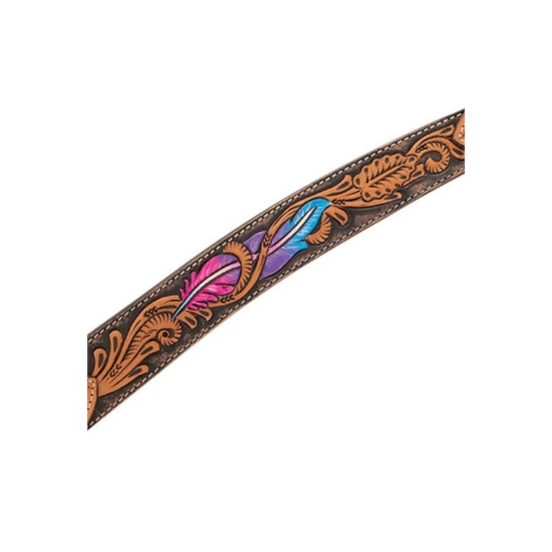 Light oiled leather features a carved design with hand painted leather accents and subtle sanding for a touch of rustic style