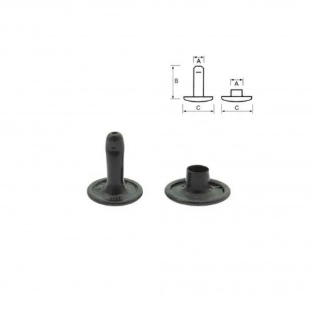 Double cap saddlery rivet with a notch (very useful near the end of the shank) that will speed up the riveting process, primarily for belts, collars and harnesses, and increase the strength of the joint. Double cap rivets are used when both sides of the rivet are visible or when a rivet comes in contact with other surfaces (handbags and other handles, leashes, collars, harnesses,...).