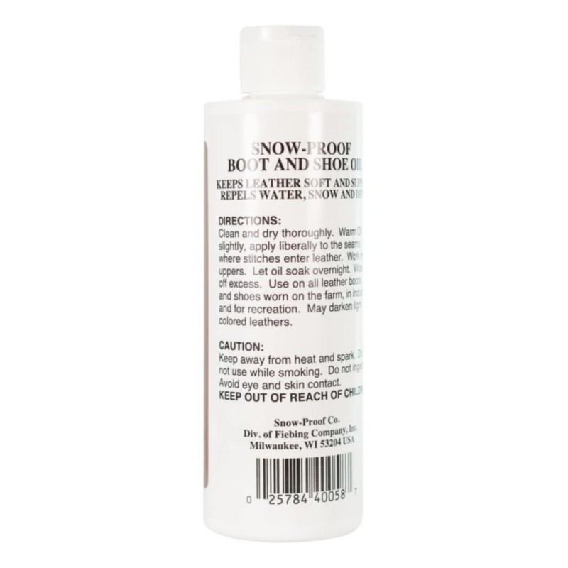 Formulated especially for work boots and hunting boots. Snow-Proof Boot & Shoe Oil provides essential oils that soften, preserve and prolong the life of leather. It is also suitable for waterproofing hard-to-reach seams in boots.