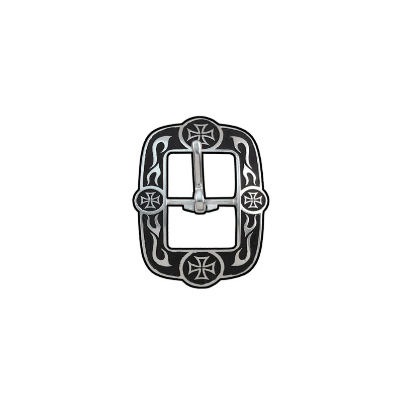 Jérémiah Watt's Centerbar Buckle or some call them double buckles. Made of stainless our buckle tells the story of salvation with its cross and flame motif. Made of stainless